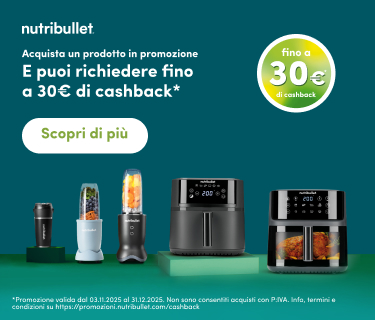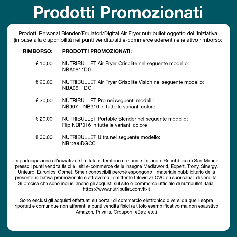 *Dal 3.11.2025 al 31.12.2025 acquista Personal Blender/Frullatori/Digital Air Fryer nutribullet® [VEDI MODELLI e PUNTI VENDITA] e conserva lo scontrino con la confezione del prodotto.